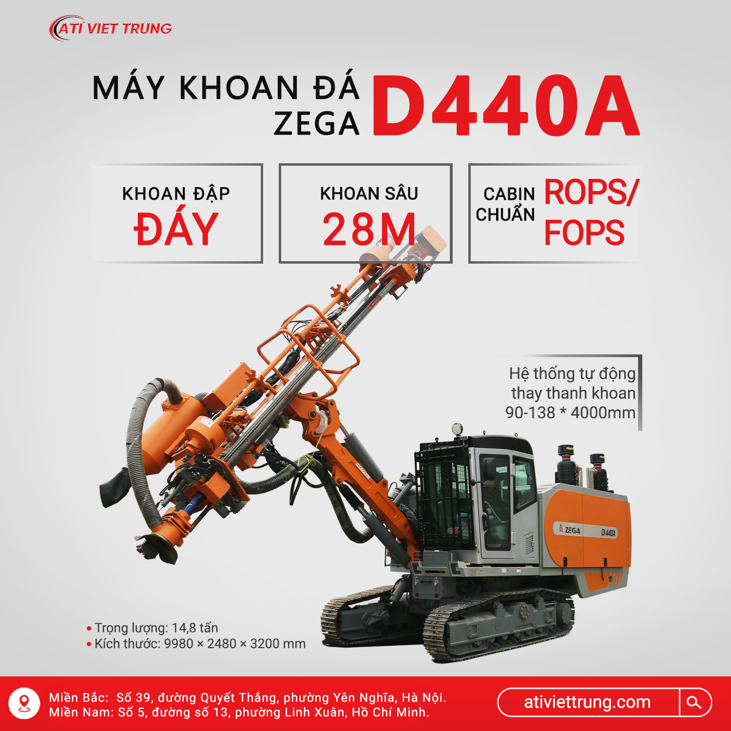 Trong lĩnh vực khai thác mỏ lộ thiên và thi công khoan nổ mìn, việc lựa chọn thiết bị khoan phù hợp quyết định trực tiếp đến năng suất, chi phí nhiên liệu và độ ổn định sản xuất. Máy khoan đá Zega D440A là thế hệ máy khoan búa đập đáy DTH (Down The Hole) hiện đại, được ATI Việt Trung phân phối và tư vấn kỹ thuật cho các mỏ đá, mỏ than và mỏ quặng trên toàn quốc.